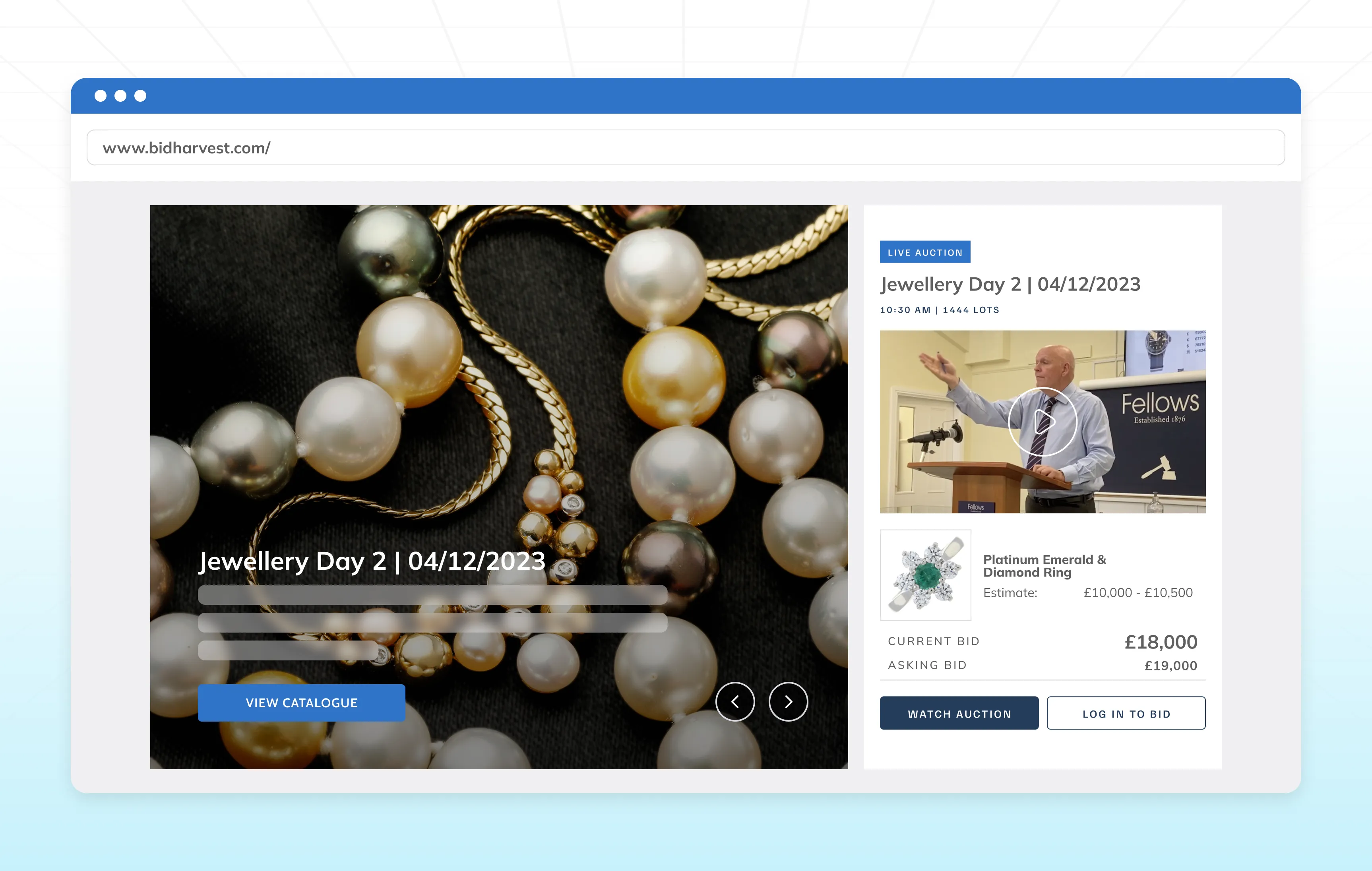 Live auctions are high-intensity, time-critical events, and your website needs to keep up. With BidHarvest®, you can stream your live auctions directly from your homepage and catalogue views, eliminating confusion and giving users immediate access to bid.