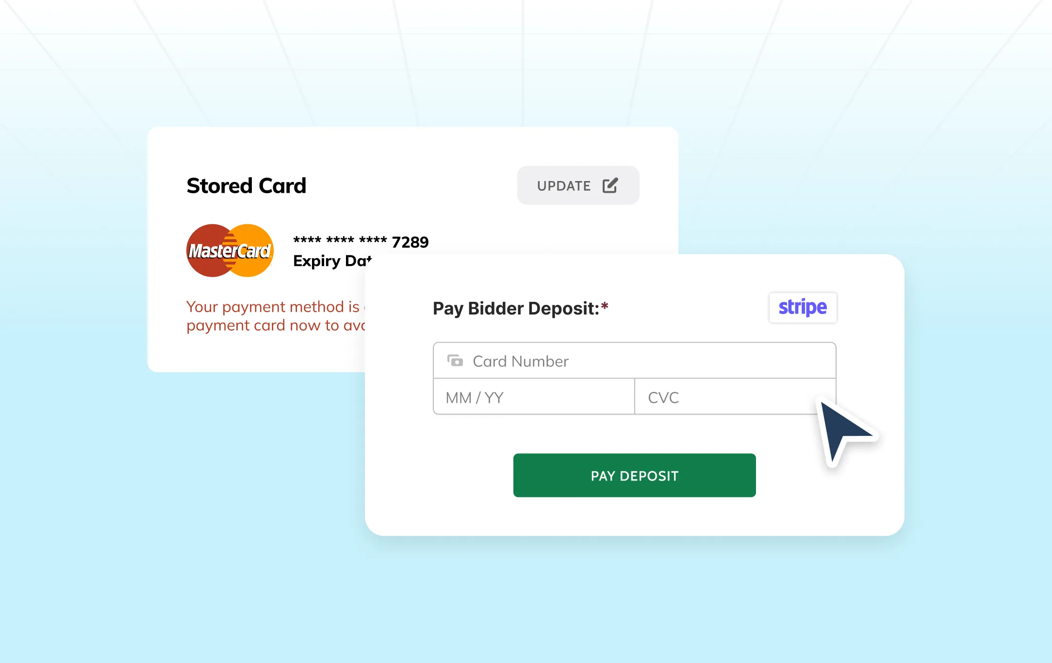 Yes. We support multiple online merchants, including Opayo, WorldPay and Stripe. Stripe is the most feature rich system, supporting the capture of cards with 3DS checks and storing a token that can be used by your team to prove that the user is who they say they are, and to take auto payments and bidder deposits automatically.